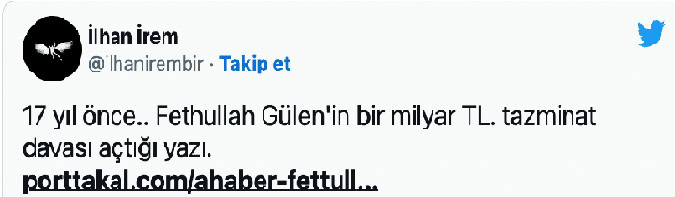 İrem, 15 Temmuz 2016’daki darbe girişiminden yaklaışık 17 yıl önce, Kasım 1999’da Antalya’da yayımlanan Yeni İleri Gazetesi’nde “Barış” başlığıyla yayımlanan köşe yazısında, Fethullah Gülen’e “Fetuş” diye hitap ettiği için dönemin parasıyla 100 milyon lira tazminata mahkûm edildiğini duyurmuştu. Sanatçı, Twitter hesabından “17 yıl önce.. Fethullah Gülen’in bir milyar TL. tazminat davası açtığı yazı” anonsuyla, aldığı cezaya ilişkin haberin linkini paylaşmıştı. İrem’in paylaştığı linkteki haberde, tazminat davası ve karar ilişkin olarak şu bilgiler veriliyor: